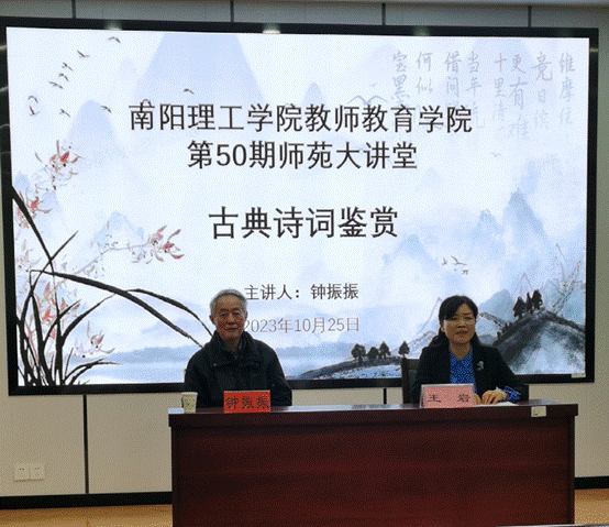 “满园花菊郁金黄,中有孤丛色似霜”,正值重阳节到来之际,钟振振作为南阳市重阳文化节的特邀嘉宾,给我院师生作了这场殊有难得的学术报告。王岩表示,能够如此近距离面对面地聆听国内顶尖的学问大家和学术大咖的教诲,是教师教育学院师生们的殊荣和“幸福”。