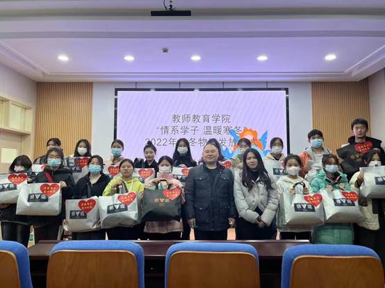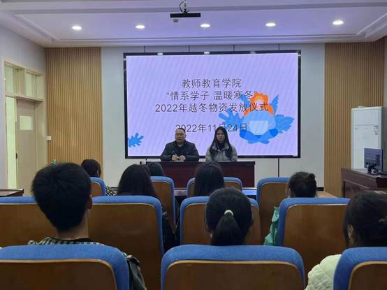 本网讯(学生记者/赵昊)为深入贯彻党和国家有关高校困难学生资助政策,2022年11月24日,教师教育学院在22教师苑大讲堂举行“情系学子 温暖寒冬”2022年越冬物资发放仪式,本次仪式由教师教育学院资助专干聂冬栋主持,全体受助学生参加。