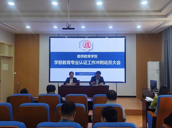 本网讯(记者/金博)为进一步推进我院学前教育专业认证工作,2022年10月25日,教师教育学院举行学前教育专业认证工作冲刺动员大会。会议由院长王岩主持,学院党委书记冯建、党委副书记陈同勉、副院长钞艺伟、司冬梅、周凤瑾及全体教师参加会议。