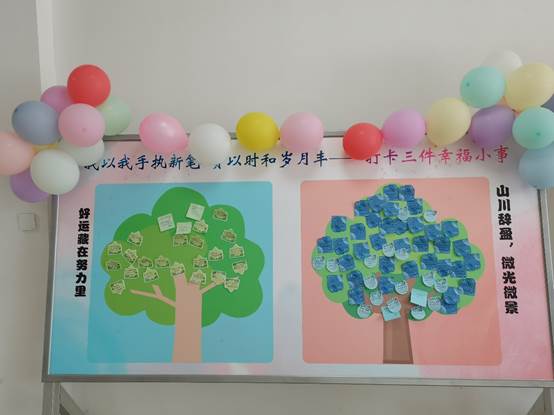 此次活动布置了四个板块,学生们在纸上写下让自己感到开心的小事,贴在“幸福树”上,记录自己生活中的小确幸。同学们互相讲述自己的小确幸,回忆生活中的细节,重温幸福时刻。