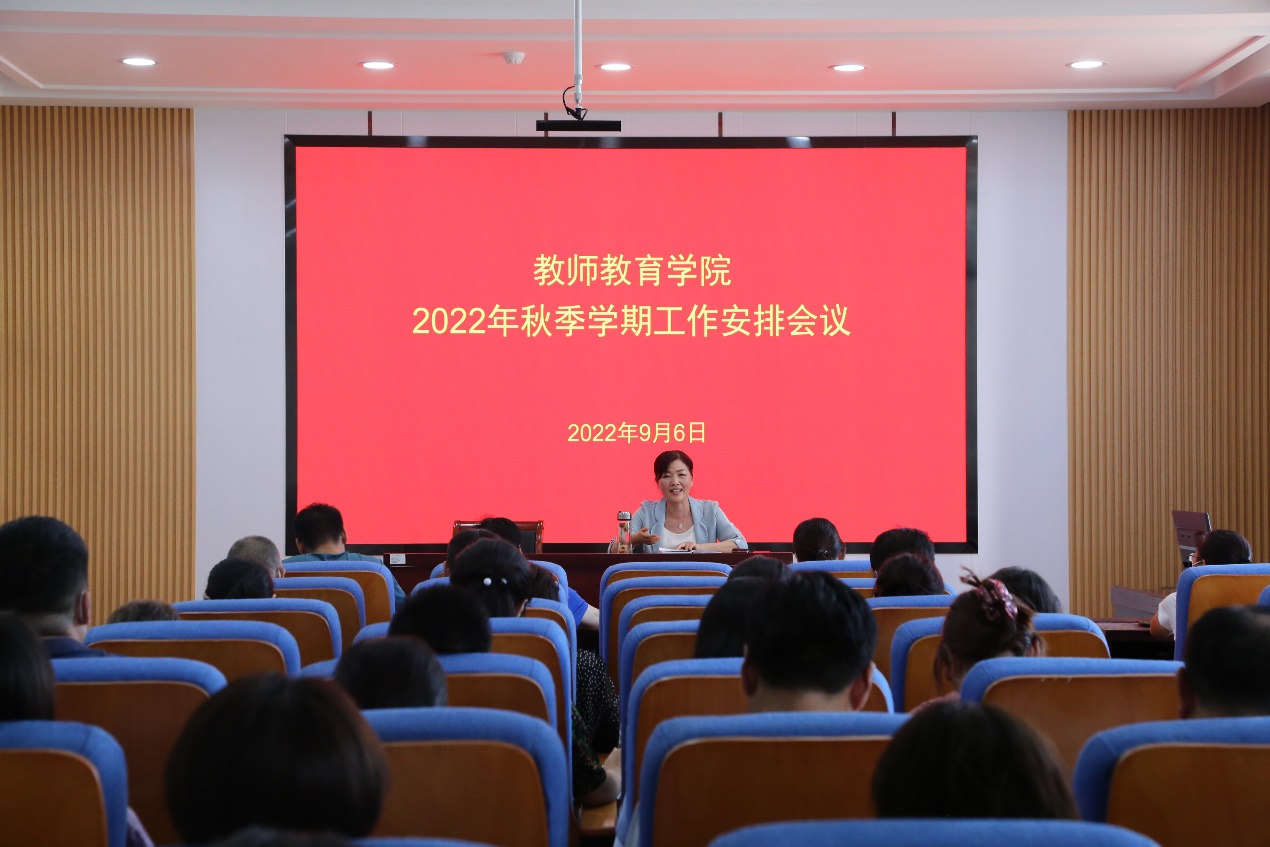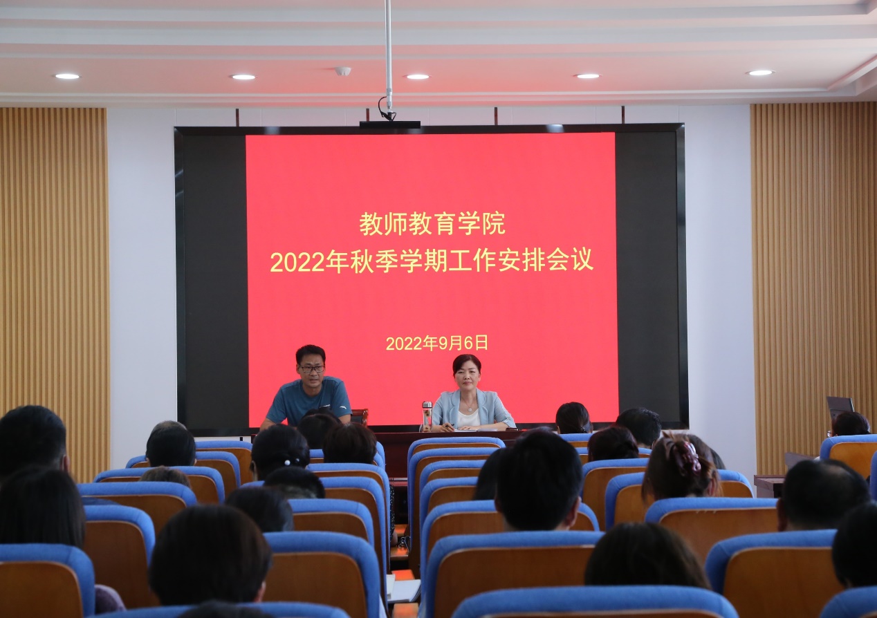 本网讯(学生记者/雒欣甜)为切实做好开学初期各项工作,2022年9月6日下午,教师教育学院在22号教学楼师苑大讲堂召开2022年秋季学期工作安排会议,回顾总结暑期工作,安排部署新学期各项工作,学院领导班子、全体教职工参加会议。