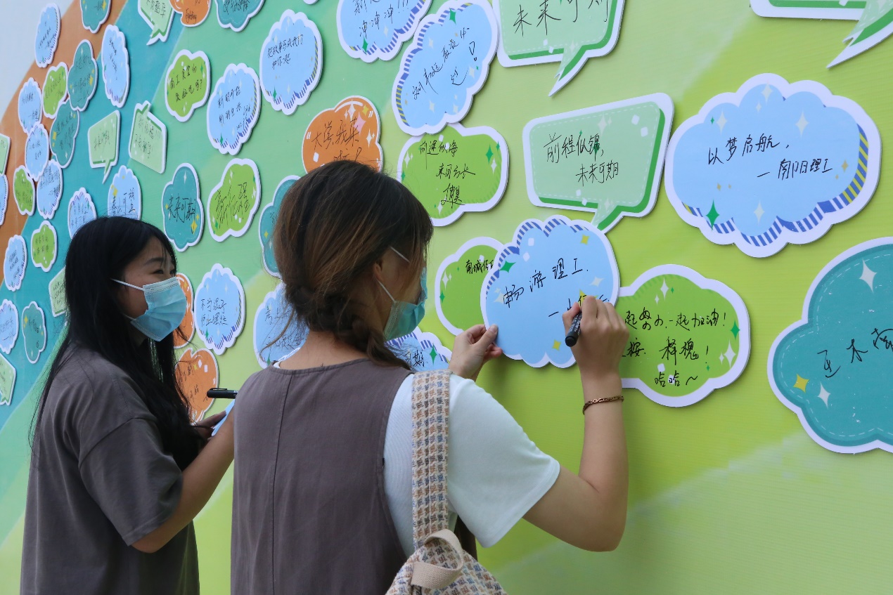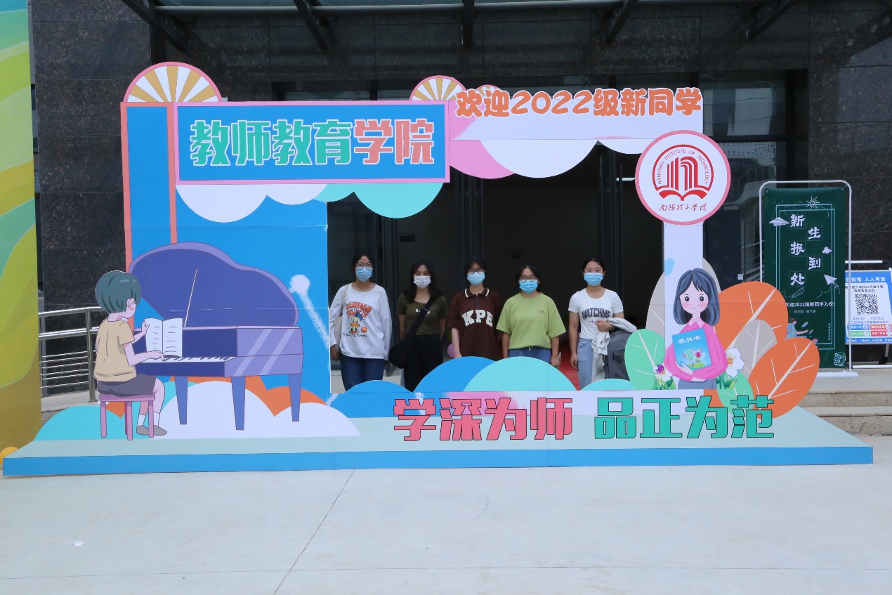 教师教育学院系楼前,迎新主干道被多彩气球围绕延展,仿佛是一条缤纷的花径;另有红毯长铺迎进教学楼,彰显出我院对新生的欢迎热情;立体迎新板融合我院多样元素:左下角动画人物正在弹奏钢琴,仿若优美琴声传入耳间,右侧教师形象的动画人物环书微笑、端庄而立,教育内涵悠然传达,正下方以四字点睛——“学深为师,品正为范”,示意每位新生从此刻起树立起育人精神、在育人之路上坚定自我;迎新干道左侧还设有签到墙,斑斓底色象征多彩未来,新生们可以自由选择个人打卡、合影留念,记录下大学生活“第一帧”。
