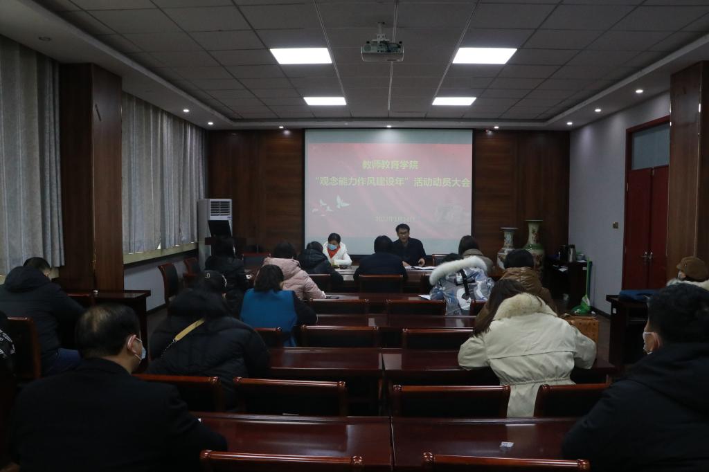 本网讯(记者/赵尊)2022年1月14日下午,教师教育学院在四号楼会议室召开“观念能力作风建设年”活动动员大会。会议由学院党委书记冯建主持,学院领导班子和全体科级干部参加会议。