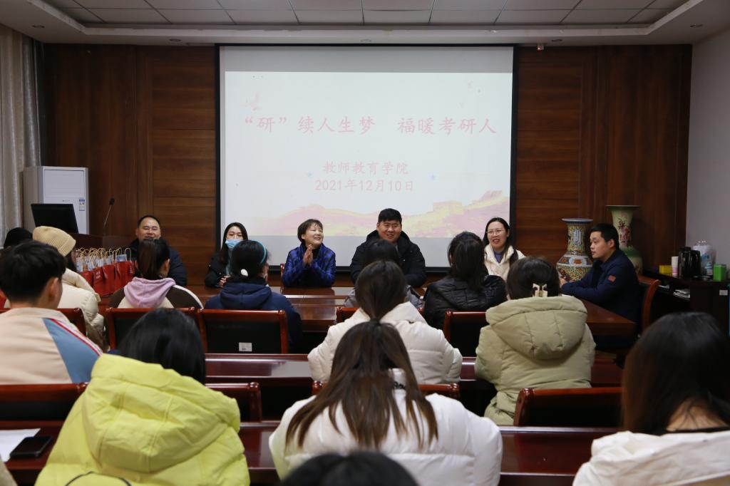 本网讯(特约记者/何雷雨 学生记者/欧阳颖)为增强考研学子的备考信心,12月10日,教师教育学院开展了主题为“研”续人生梦,福暖考研人的考研送温暖活动。学院党委副书记陈同勉和全体辅导员参加此次活动。