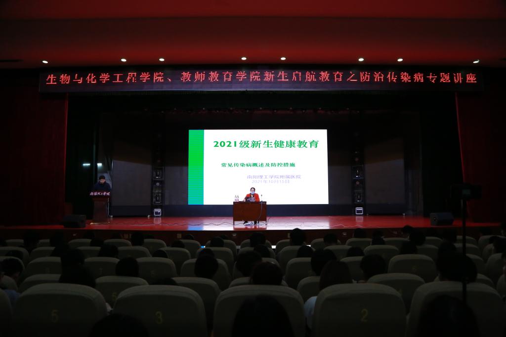 本网讯(学生记者/赵夏妍)为了提高全体师生的卫生防疫知识和自我安全保护意识。10月21日,教师教育学院联合生物与化学工程学院在毕业大厅举办新生启航教育之防治传染病专题讲座,主讲人为南阳理工学院附属医院赵玉静医生,2021级全体新生参加讲座。