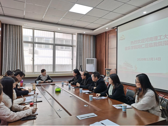 12月14日,河南理工大学音乐学院党总支副书记王建军、副院长马安平一行5人到我院考察调研。学院院长王岩、党委书记冯建、副院长周凤瑾及教师代表参加了座谈会。