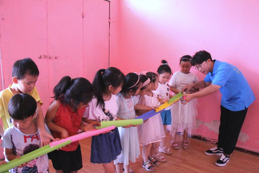 图为志愿者给孩子们讲述游戏规则、进行示范,并参与其中与孩子们同笑同乐。