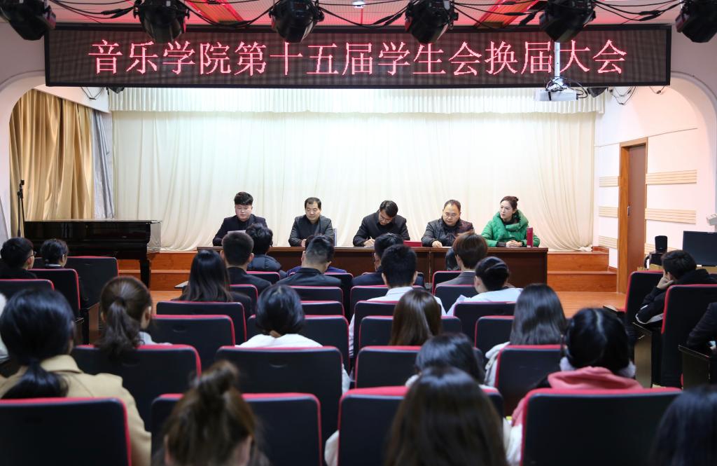 本网讯(通讯员/朱套套)音乐学院于2019年11月29日在207多功能厅举行第十五届学生会换届大会。出席此次会议的领导老师有:党总支书冯建、团学办主任聂冬栋、辅导员侯凯中、刘小婷,音乐学院全体学生会成员参加了此次大会,大会由聂冬栋主持。