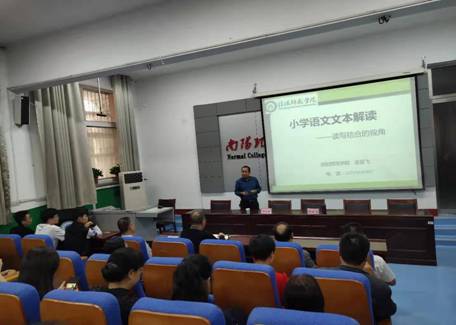 在本次活动中,连亚飞博士从读写结合的视角,对小学语文文本进行了详细的解读。连博士先从语文教师的专业性的具体体现、语文教师必备的素质入手,讲到怎样理解读写结合、读写结合的常见误区、什么是真正的读写结合等问题,随后连博士运用教育学相关理论,论及读写结合在中小学教学实践中的重要性,最后连博士又创造性的给大家呈现了语文文本解读的三个层次。
