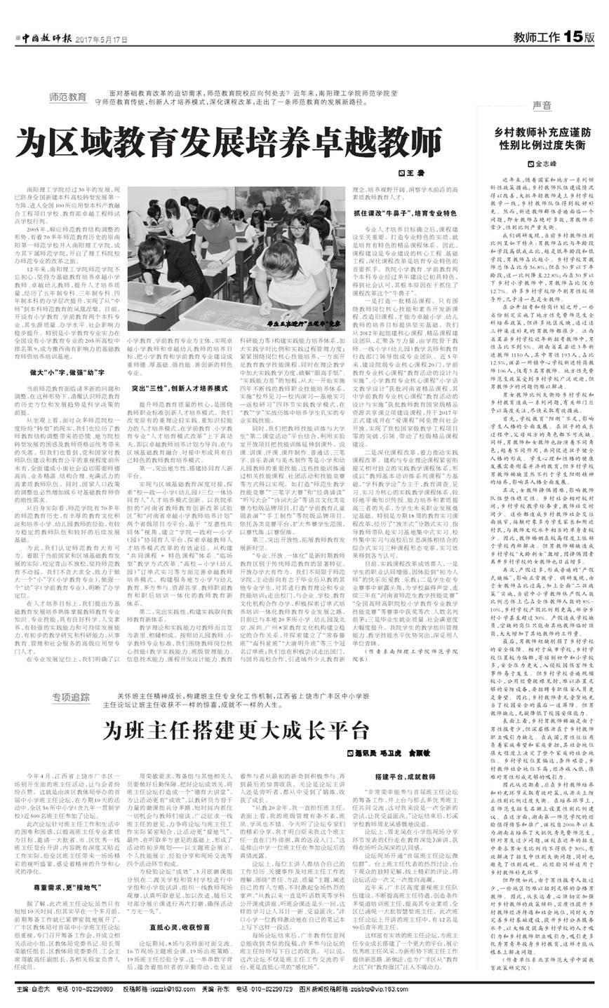提升师范教育质量的核心,是围绕教师职业标准创新人才培养模式。我们改变原有的重理论轻实践、重知识轻能力的人才培养模式,在学前教育、小学教育专业“人才培育模式改革”上下真功夫,即以卓越教师培养计划为导向,在与区域基础教育融合、对接中形成具有自己特色的教师教育培养模式。