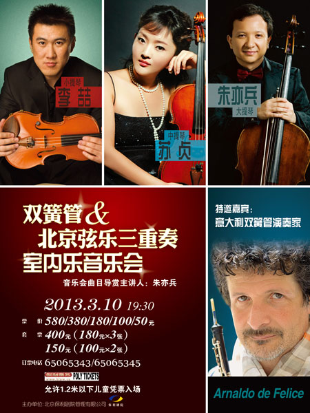 由三人组建的北京弦乐三重奏为观众演奏包括莫扎特《F大调双簧管与弦乐四重奏》、贝多芬《C小调第五弦乐三重奏》以及英国作曲家布里顿的为双簧管和弦乐三重奏创作的《幻想曲》等多部室内乐经典作品, 来自意大利双簧管演奏家阿尔那多.德.费里齐也将受北京弦乐三重奏邀请加盟此次演出。