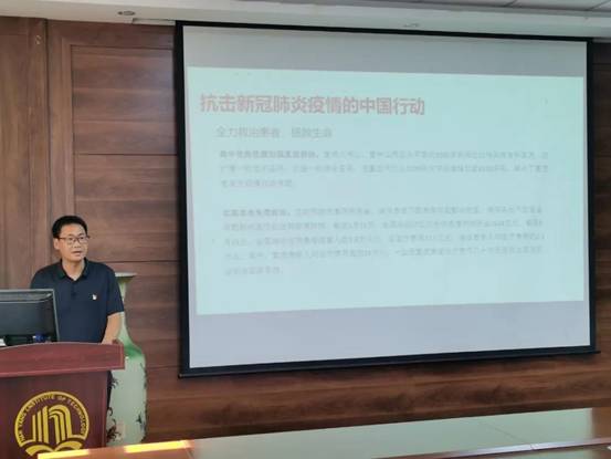 活动中,党委书记冯建以“发挥党员先锋模范带头作用,让党旗在战疫一线高高飘扬”为题为全体党员上党课。他首先带领大家一起回顾了抗击新冠肺炎疫情的中国行动,提出了共产党先锋模范作用的具体要求,结合南阳市以及我校在疫情防控期间的实际工作讲解如何发挥共产党员先锋模范作用。冯书记激励全体党员要在新的形势下,牢记使命、敢于担当、奋勇争先,充分发挥新时代共产党员先锋模范作用,做新时代的合格党员。
