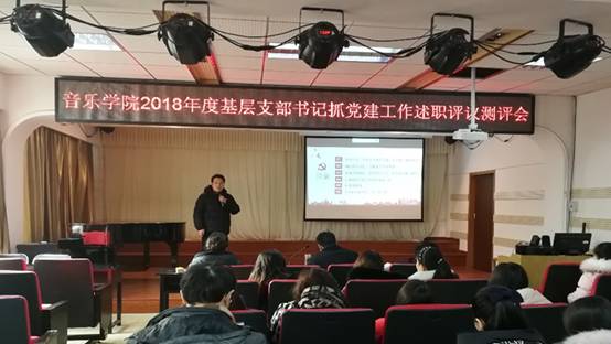 为全面提升我院党建工作质量,根据《中共南阳理工学院委员会组织部关于开展2018年度各级基层党组织书记抓党建述职评议考核工作的通知》要求,1月15日下午,音乐学院党总支在12号楼207多功能厅召开2018年度基层支部书记抓党建工作述职评议测评会。学院党总支委员、各党支部书记、教工党员和部分民主党派教师代表参加,会议由党总支书记冯建主持。