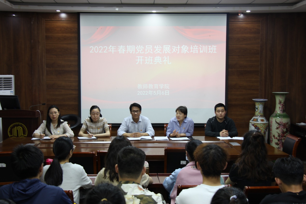 本网讯(特约记者/何雷雨 学生记者/欧阳颖) 5月6日,教师教育学院在四教二楼会议室举办2022年春期党员发展对象培训班开班典礼。学院组织员、学生党支部书记和24名党员发展对象参与典礼,典礼由学院党委副书记陈同勉主持。