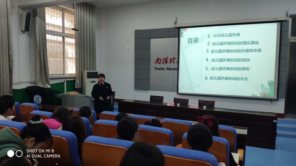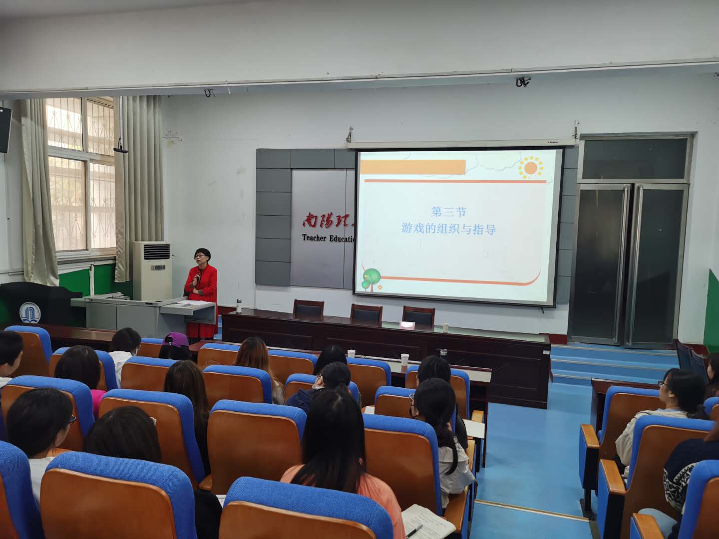 张勇园长以《幼儿园游戏活动的组织与开展》为题,从游戏对幼儿成长的意义、游戏的含义和种类、游戏的组织与指导以及幼儿园游戏形式的创新等内容作了阐述。她强调:幼儿园教育应尊重幼儿的权利与人格,以游戏为基本活动,把游戏作为对幼儿进行全面发展教育的重要形式。叮嘱同学们要满身是爱,时刻关注孩子,深刻了解孩子们游戏发展的细节。