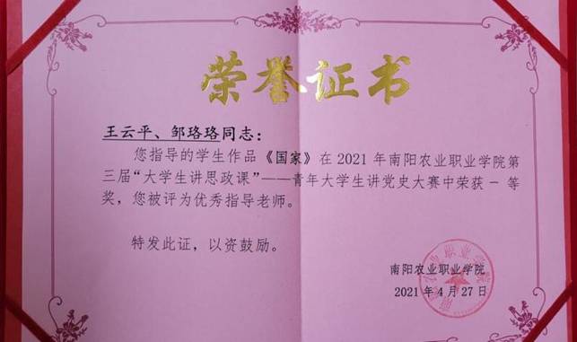 3、第三届“大学生讲思政课”——青年大学生讲党史大赛优秀指导老师 南阳农业职业学院