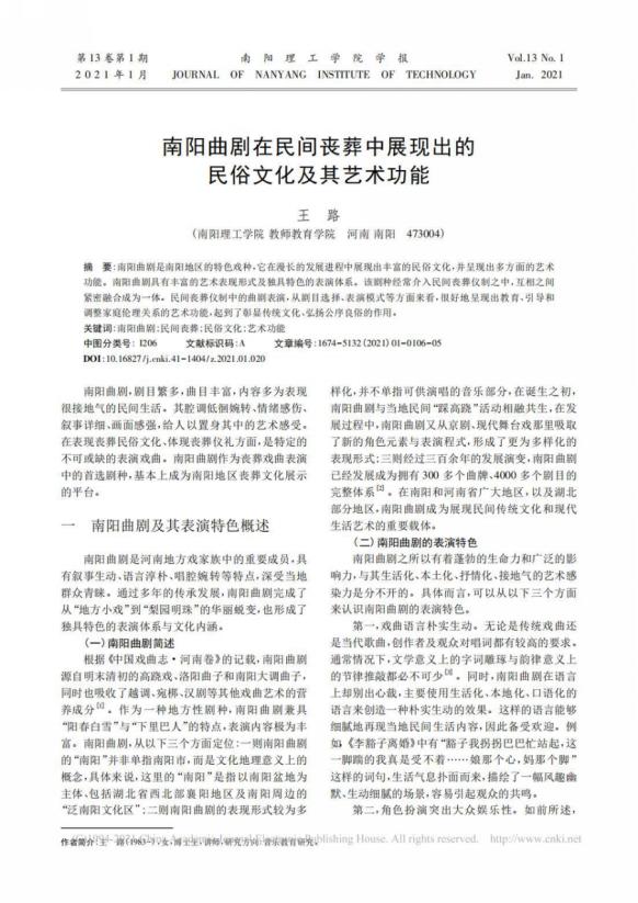 15.南阳曲剧在民间丧葬中展现民俗文化及呈现的艺术功能 南阳理工学院学报