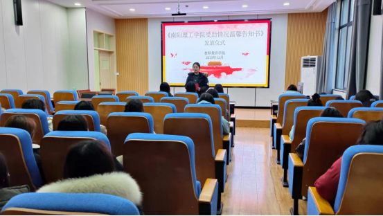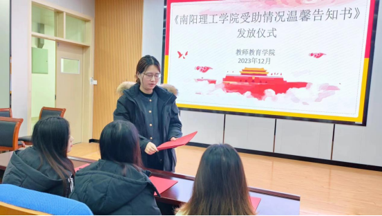 本网讯(学生记者/崔佳宁)为全面落实学生资助政策,加强学生资助规范管理,大力推进精准资助和资助育人工作,我院于2024年1月5日下午,在师苑大讲堂组织开展《南阳理工学院家庭经济困难学生受助情况温馨告知书》发放仪式暨填写说明会(以下简称《告知书》)。
