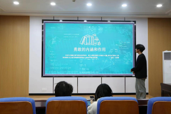 主讲人分别从三个方面来阐释这一专题。讲述了勇敢的内涵、作用及价值,回答了如何培养勇敢,用勇敢来实践应用等内容。后面同学们通过课件讲解和视频展示深刻认识到了勇敢的重要意义。此外,主讲人还带领大家一起进行击鼓传花游戏,它是对被选中的同学的一次挑战,也是一个突破自大胆尝试的机会。最后,主讲人进行了总结与反思,强调了勇敢对人生的帮助以及意义,鼓励同学们要积极勇敢的面对生活中的困难和挑战。