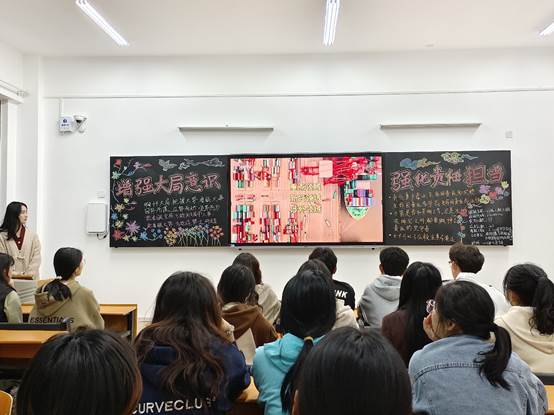 各班团支书首先向同学们介绍了近期重大会议及主要议程。接着动员同学们讨论关于对责任担当精神的感悟、看法,以及对未来发展走向的规划。同学们从中更加深刻了解了社会主义发展所需的大局观念以及责任担当意识,并更加理解了它对于我们生活的意义与价值。