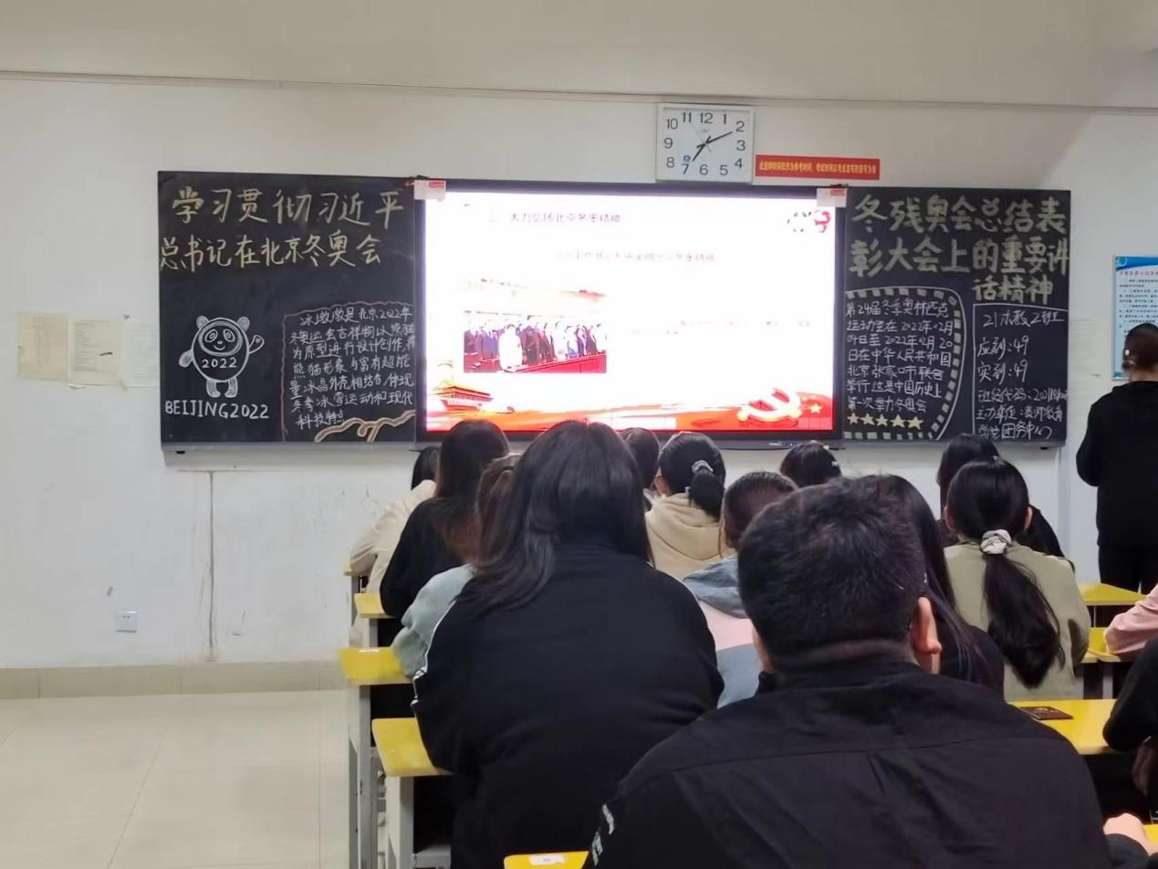 活动伊始,各班团支书采用播放视频的方式,引领同学们回忆北京冬奥会、冬残奥会上运动健儿们不畏强手、顽强拼搏的英姿。“中国人民同各国人民一道,克服各种困难挑战,再一次共创了一场载入史册的奥运盛会,再一次共享奥林匹克的荣光!”耳边再次响起习近平总书记熟悉的声音。活动接近尾声,团支书对此次活动进行了总结,促使同学们深刻理解习近平总书记的讲话内容,更加透彻地学习奥运精神和体育精神。