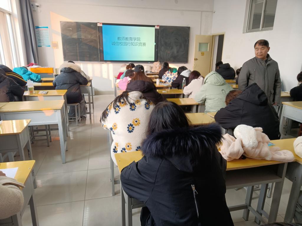 本网讯(学生记者/张文娜)为有效宣传高校资助政策、普及征信和金融知识、强化诚信教育,12月15日,教师教育学院在10号教学楼514教室举办“诚信校园行”资助知识竞赛,学院40余名优秀学子积极参加。