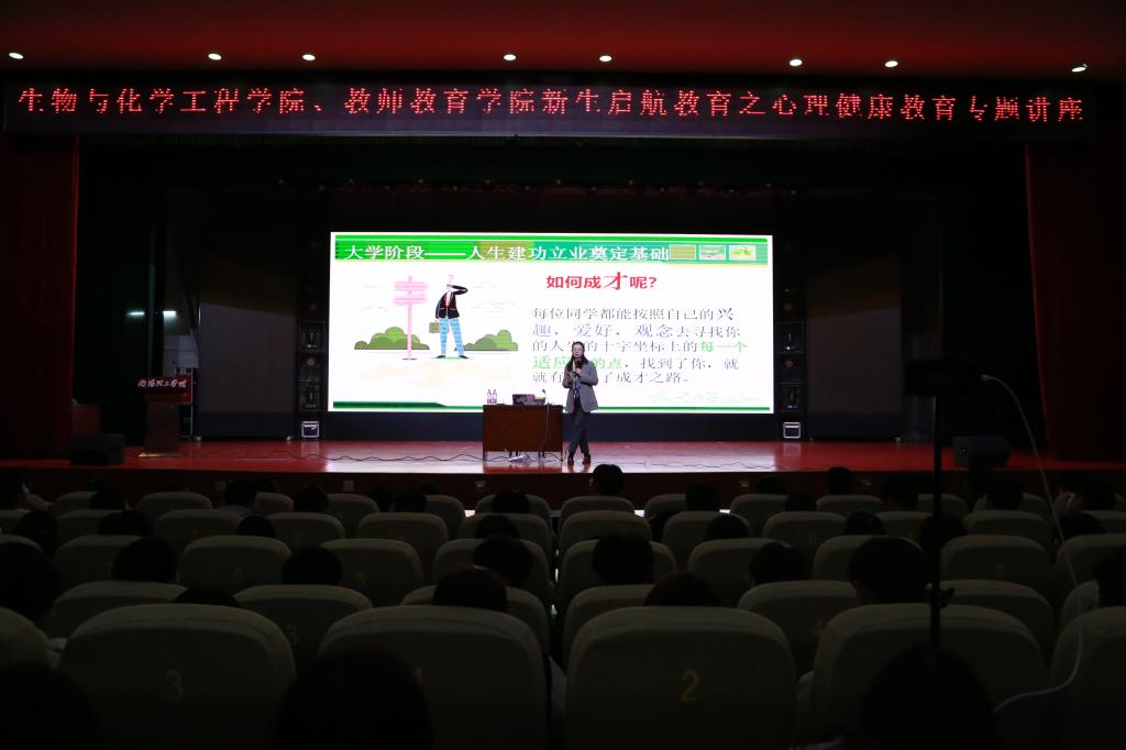本网讯(学生记者/赵夏妍)为提高大学生心理素质,帮助学生了解自己的心理健康问题。10月21日,教师教育学院联合生物与化学工程学院在毕业大厅举办新生启航教育之心理健康教育专题讲座,主讲人为心理健康教育中心莫华敏老师,2021级全体新生参加讲座。此外,本次讲座还通过线上直播的方式方便同学们观看。