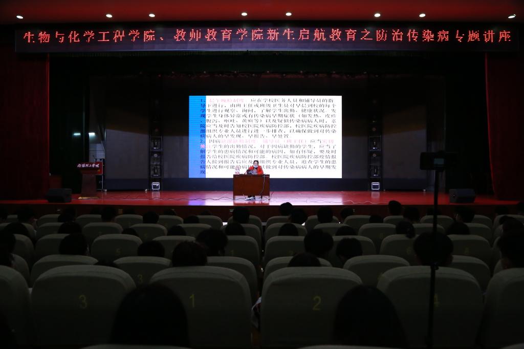本网讯(学生记者/赵夏妍)为了提高全体师生的卫生防疫知识和自我安全保护意识。10月21日,教师教育学院联合生物与化学工程学院在毕业大厅举办新生启航教育之防治传染病专题讲座,主讲人为南阳理工学院附属医院赵玉静医生,2021级全体新生参加讲座。