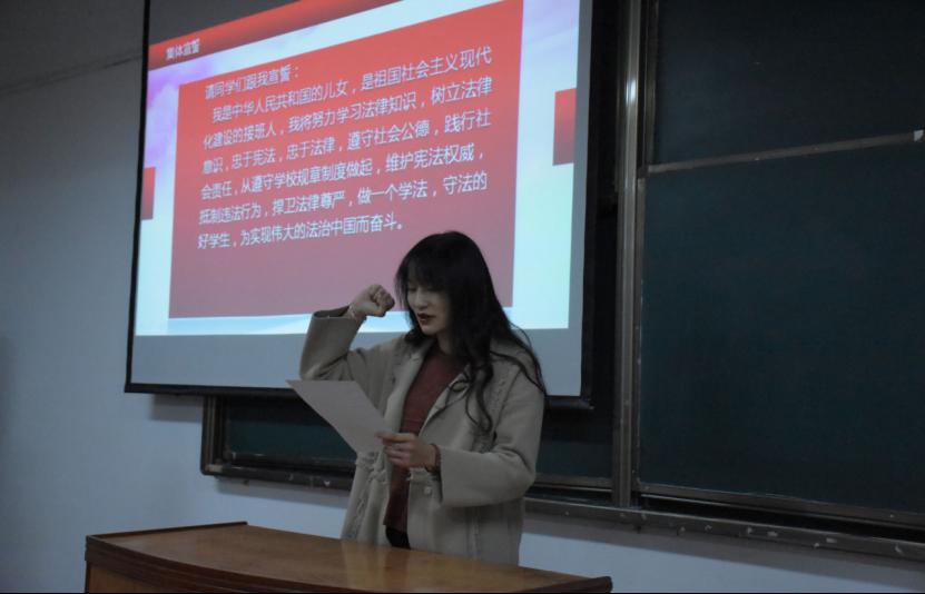 活动初始,由主持人徐俊科介绍国家宪法日的由来。在活动的第一环节“集体宣誓”中,全体同学肃穆庄重,精神抖擞地跟着马周萌同学一起宣誓。