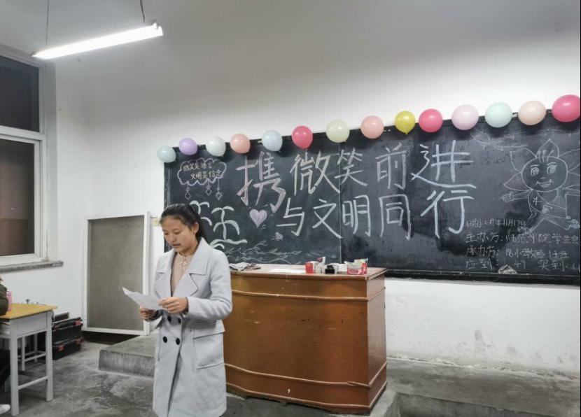 为了丰富我院学生对微笑与文明的认识,营造积极向上、文明礼貌、舒适优雅的校园文化环境,11月17晚,师范学院18、19全体学生在教学楼各班举办了“携微笑前进,与文明同行”主题班会。