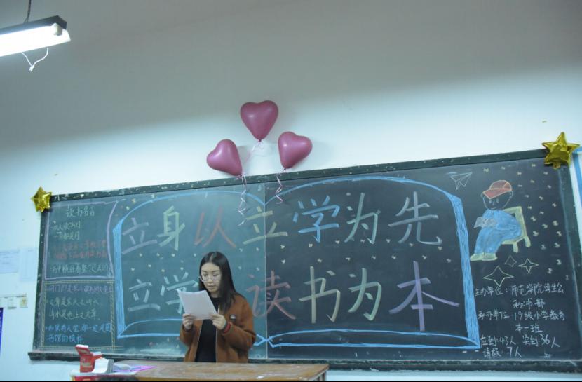 书籍,是人类进步的阶梯。为了重温中华文化精髓,丰富同学们的阅历和提高同学们的综合素质,11月14日晚,由师范学院学生会秘书部组织的以“立身以立学为先,立学以读书为本”为主题的主题班会在18、19级各班内召开,18、19级各班同学均按时参加。