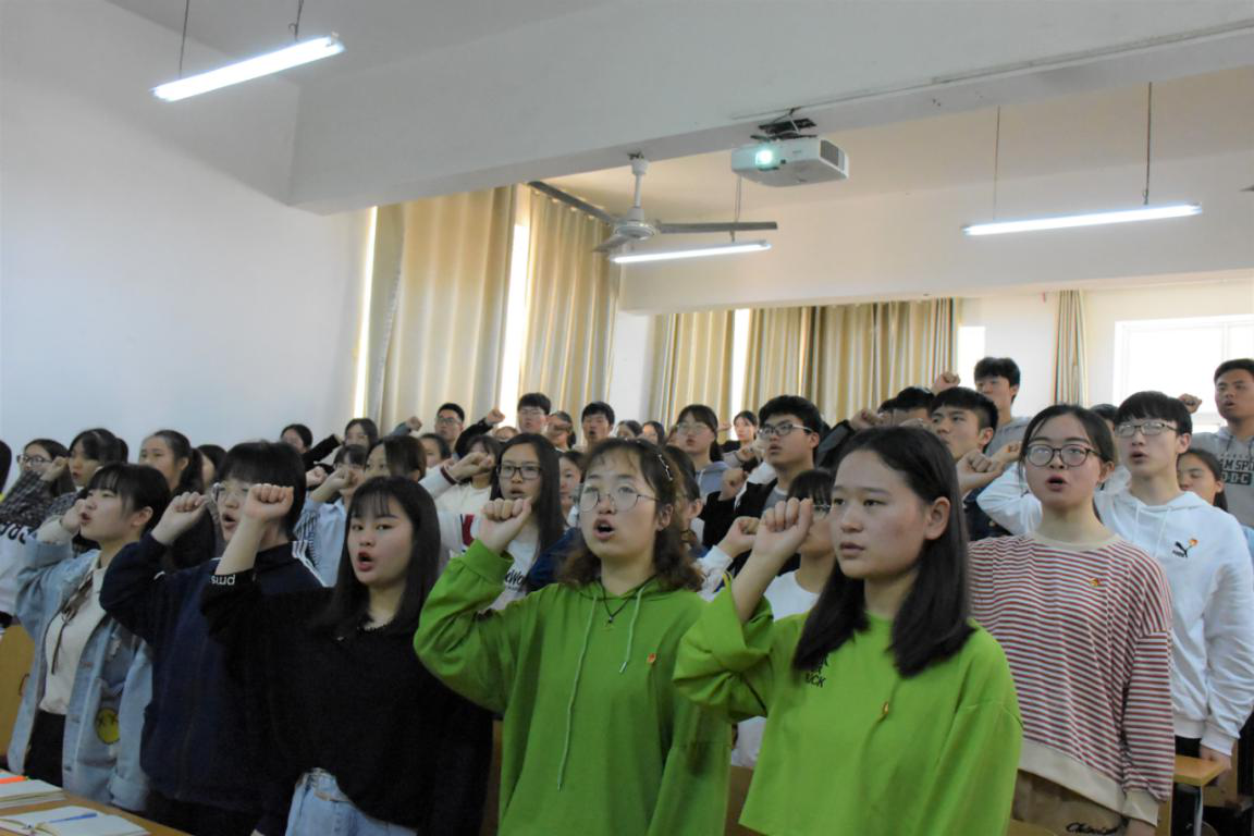 在优秀学生代表王崇美的带领下,学员们全体起立举起右拳重温入团誓言;