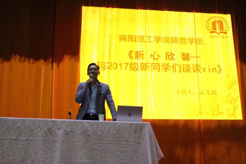 (学生记者/蔡郁珍 李林蔚)为了培养学生良好的心理品质,从认识、情感、行为各方面去适应大学,积极地面对生活,10月26日,师范学院于小礼堂举办以“新心欣馨---------与2017级新同学们谈谈xin”为主题的大学生心理健康知识讲座。本次讲座由南阳理工学院心理咨询中心教师孟凡锐主讲,党委副书记李勇、团学工作办公室主任陈飞及17级辅导员亲临现场同17级新生共同聆听讲座。