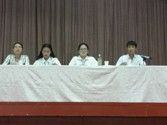 讲座内容分为学生会介绍、学校管理条例、安全教育、社团介绍四项。首先由学生会主席叶琳为同学们介绍了主席助理、纪律学习部、劳卫生活部等学生会十个部门的日常工作,并欢迎各位同学加入学生会,为学院贡献自己的力量。接着,学生会副主席郭晓宇和学生会副主席平硕磊分别为同学们讲解学校管理条例,讲述在生活中遇到的安全问题并告诫同学们提高安全防范意识。最后,学生会副主席李同心对学生组织以及广播站、海蓝剧社,魅力舞团等社团进行介绍。