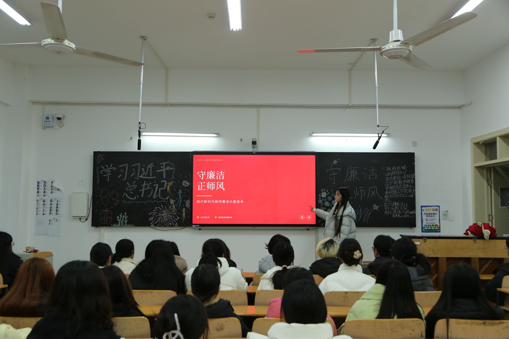本网讯(学生记者/叶华健)为深入推进师德师风建设,引导师范生扣好职业生涯“第一粒扣子”,筑牢廉洁修身思想根基,2025年11月23日,教师教育学院25级小学教育、音乐学学生在22教4楼公共教室开展“廉洁教育”主题班会。本次班会由各班班长主持,通过幻灯片讲解、故事分享、视频播放等丰富形式,使崇廉尚洁理念浸润同学心田。