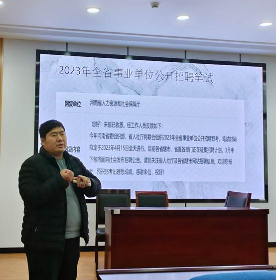 会议期间,王涵对就业方向进行了五个方面的分析:首先梳理了近几年教师资格证的报名时间与条件,科目安排以及面试环节;其次解读了国考(公务员考试)的考试时间以及面试要求;第三是详细介绍了“三支一扶”考试;然后介绍了特岗、西部计划、征兵等政策。最后分析了2023年严峻的就业形势,指出了关于就业问题的相关事项。