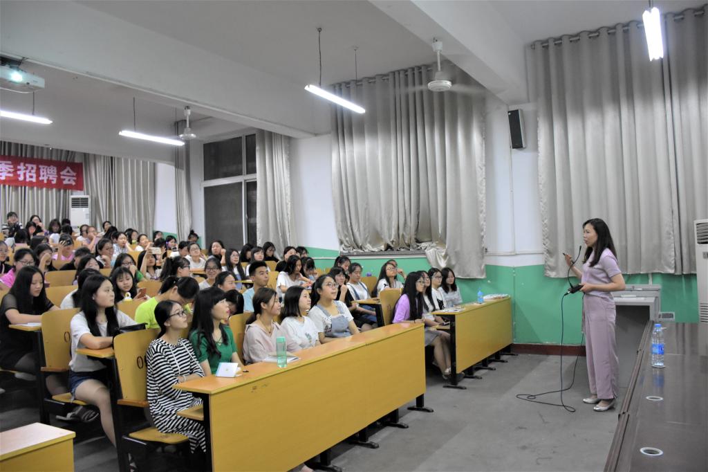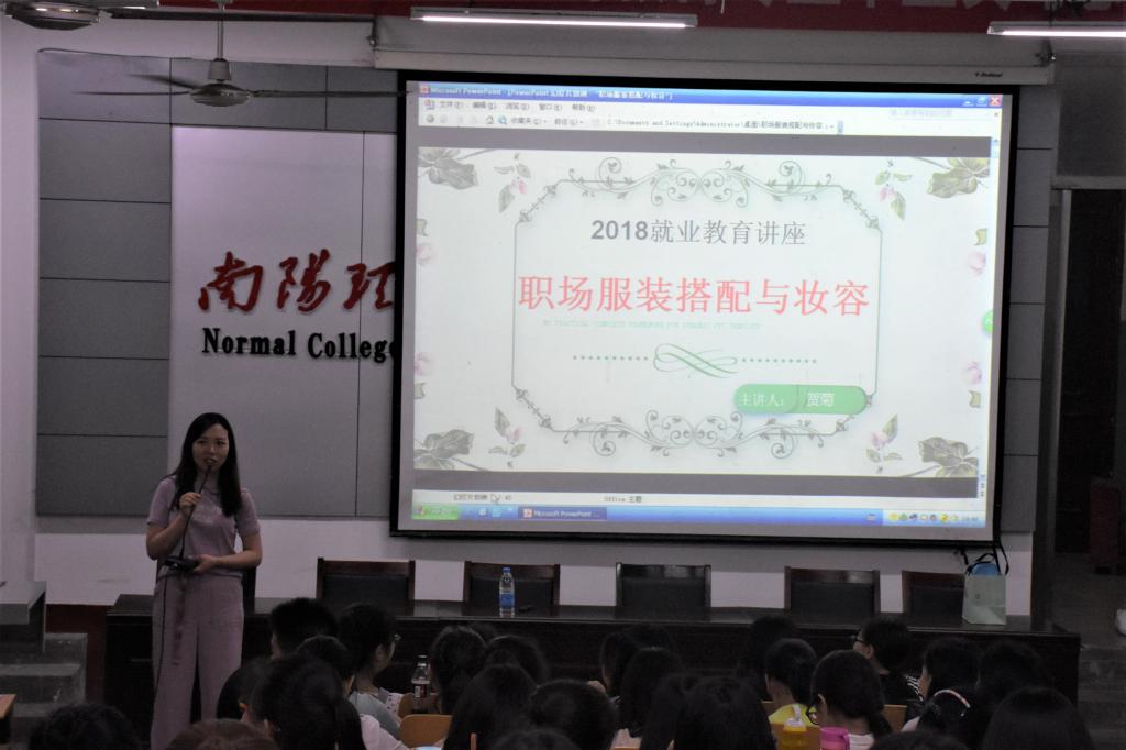 2018年6月5日晚,师范学院在阶梯教室举办“2018年就业创业教育讲座之二—职场服装搭配与妆容”。本次讲座由17级辅导员贺菊老师担任主讲人,17级120余名同学参加。