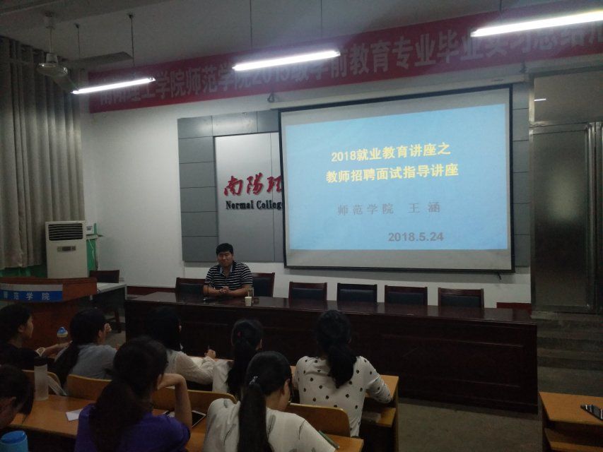 为提高教师招聘面试的通过率,提升我院学生的就业率,师范学院于2018年5月24日晚7:30在阶梯教室举办2018年就业创业教育讲座之教师招聘面试指导讲座,就业指导中心郭勇老师、周国运老师受邀参加。
