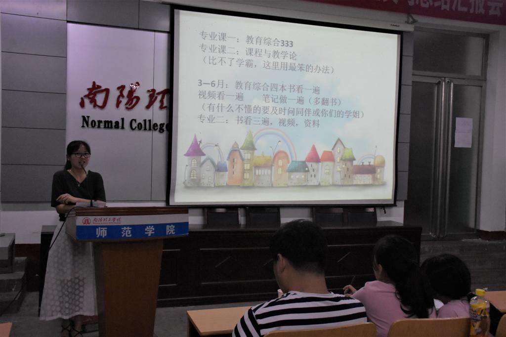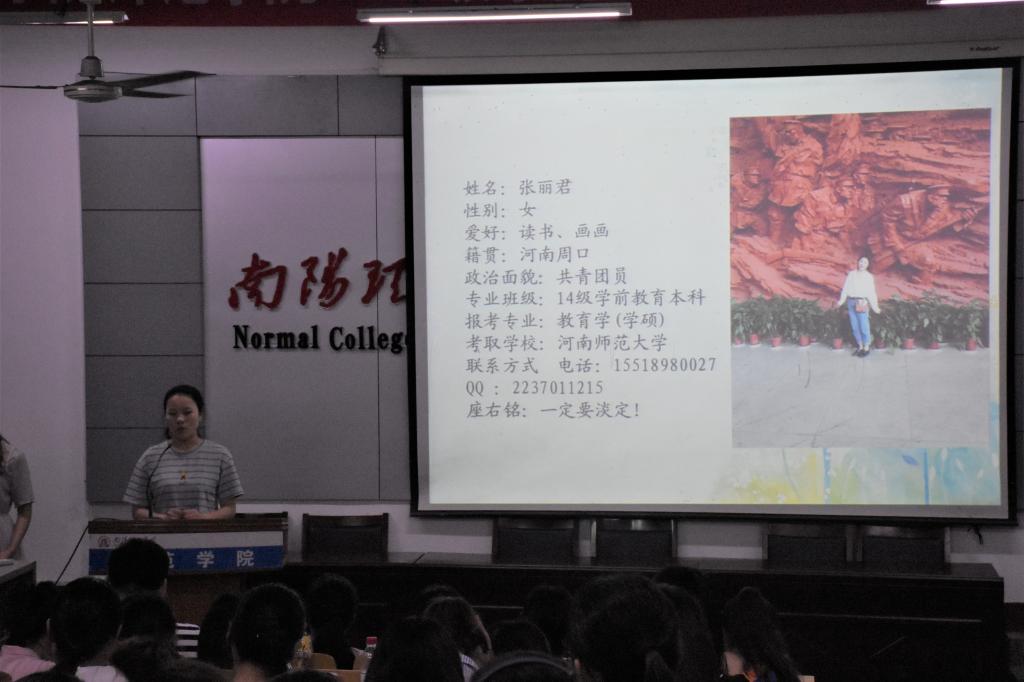 本次交流会由七位优秀考研代表分别讲授考研经验及心得,他们分别是成功考入湖南师范大学的郭旅婷,渤海大学的程雯雯,陕西师范大学的石才英,河南师范大学的张丽君,河南大学的程子豪,长江大学的王柳和云南师范大学的杨静。首先,郭旅婷学姐详细讲述了自己从前期考研准备到面试环节的感受,并与同学们分享了考研各科的复习资料,学习时间的分配及考研阶段学习与生活中常见的问题。她希望同学们在下定决心考研那天起就做好准备,不管中间有多难,有多想放弃,都请坚持到走出考场那一刻。随后,各位学姐学长结合自身经历,着重讲解了英语、政治、专业课的复习方法,考研与就业的关系,考研英语与四六级的关系,目标学校与专业的关系等问题,希望大家认真做好职业规划,确定好目标,选择最适合自己的报考院校和专业。最后,在互动交流环节中,同学们踊跃提问,学姐学长们耐心解答,现场气氛轻松活跃。